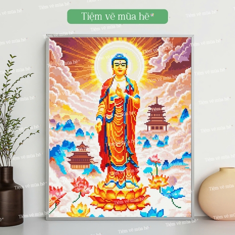 Tranh đính đá Phật A Di Đà mây ngàn đã căng khung 40x50cm có backboard