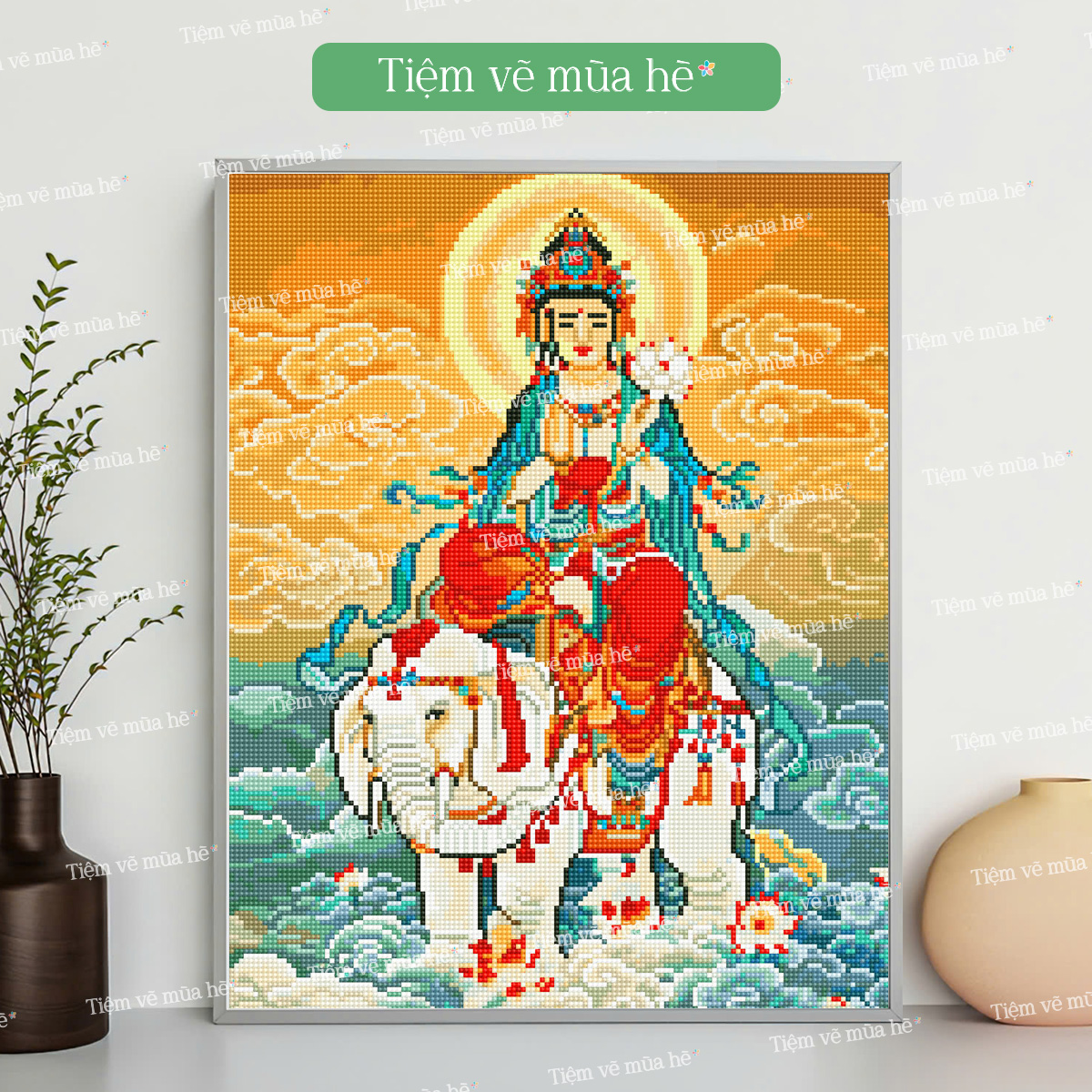 Tranh đính đá Phổ Hiền bồ tát cưỡi voi đã căng khung 40x50cm có backboard KHUYẾN MÃI - ƯU ĐÃI
